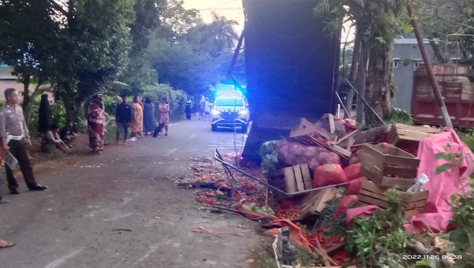 Lakalantas melibatkan dua unit truk Hino Del Van yang memuat sayur. Masing-masing dikemudikan Aco dan Ari Suardi.