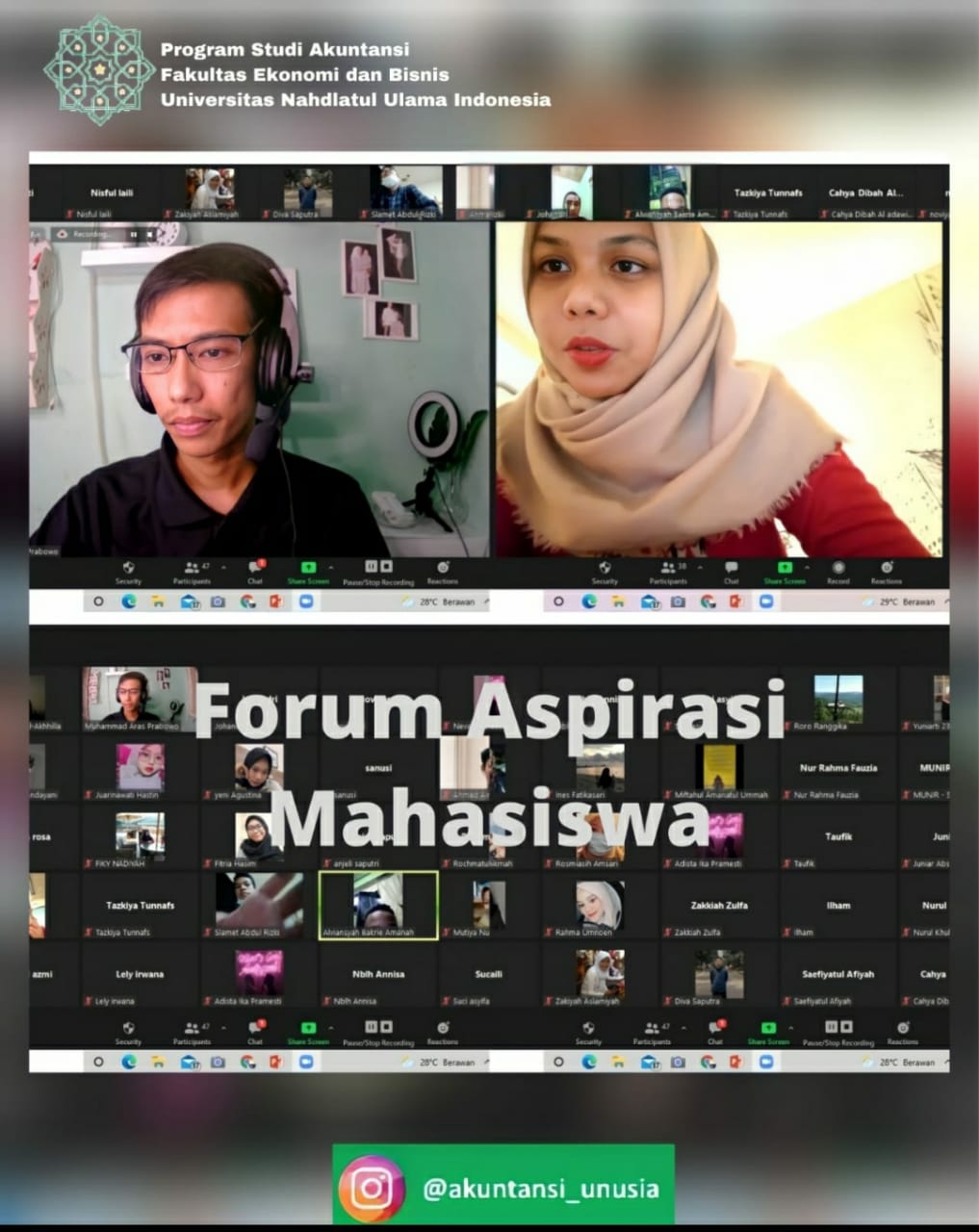 Kegiatan yang dilaksanakan melalui zoom meeting membahas mengenai kemajuan dan berbagai kendala yang mahasiswa selama proses pembelajaran. Misalnya, saran dari Slamet selaku Ketua Himpunan Mahasiswa Akuntansi (HIMA AKSI) Unusia menyampaikan bahwa kedepannya agar Prodi Akuntansi lebih proaktif dalam memberikan solusi atas kenadala yang dihadapi oleh mahasiswa, baik persoalan administratif maupun soal pembelajaran.