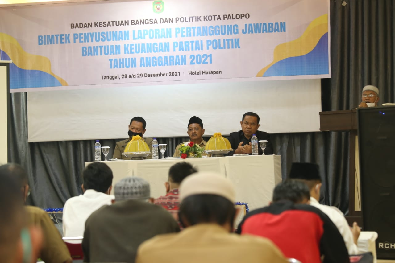 MEDU-ONLINE, PALOPO | Pemerintah Kota Palopo, melalui Badan Kesatuan Bangsa dan Politik (BAKESBANGPOL) menggelar Bimbingan Teknik Penyusunan Laporan Pertanggung Jawaban Bantuan Keungan Partai Politik Tahun Anggaran 2021 yang diselenggarakan pada tanggal 28-29 Desember 2021 di Aula Hotel Harapan Kota Palopo.