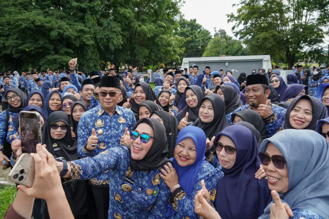 Dalam suasana penuh kedekatan, Bupati dan Wakil Bupati kemudian menyapa para peserta upacara, berbincang ringan dengan sejumlah ASN, dan melaksanakan sesi foto bersama sebagai bentuk penghargaan atas dedikasi mereka.