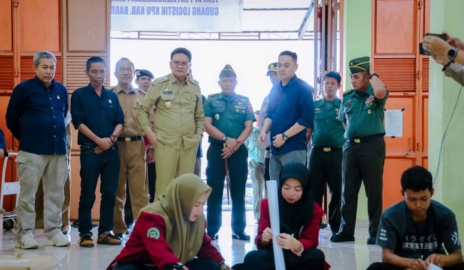 MEDIA DUTA, BARRU — Bupati Barru, Suardi Saleh bersama unsur forum komunikasi pimpinan daerah (Forkopimda) melakukan peninjauan di gudang logistik KPU Barru, jalan jenderal Sudirman, kelurahan Sumpang Binangae, Kecamatan Barru, Kabupaten Barru, Selasa (23/1/2024).