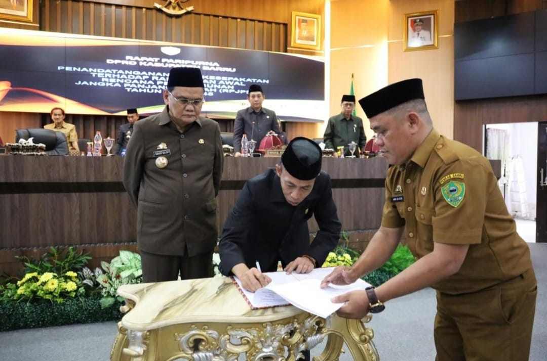 MEDIA DUTA,BARRU – Bupati Barru Tanda Tangani Nota Kesepakatan Ranwal RPJPD Kab.Barru Tahun 2025-2045 Penandatanganan Nota Kesepakatan terhadap Rancangan Awal (Ranwal) Rencana Pembangunan Jangka Panjang (RPJD) Tahun 2025-2045 ini digelar dalam Rapat Paripurna DPRD Kabupaten Barru di Ruang Sidang Paripurna DPRD Kabupaten Barru, Senin (13/05/2024).