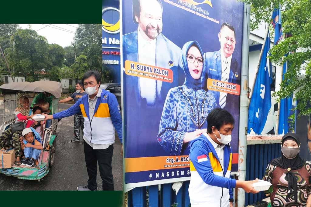 MEDU-ONLINE, MAKASSAR | Garda Pemuda NasDem Sulawesi selatan melakukan bagi-bagi 200 paket nasi dos kepada setiap pengguna kendaraan bermotor dan fakir miskin yang melintas di Jalan boto lempangan Kec ujung pandang kota Makassar, Jumat (14/01/2022) pagi.