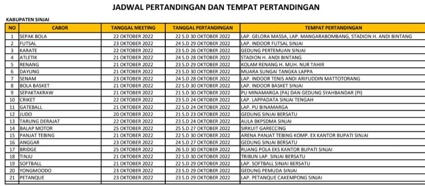 MEDU ONLINE, LUWU UTARA — Simak jadwal pertandingan dan tempat pertandingan cabang olahraga (cabor)kontingen Kabupaten Luwu Utara di Kabupaten Sinjai.