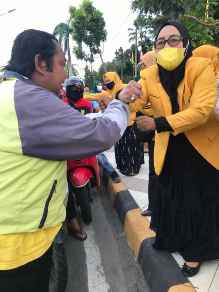 MEDU-ONLINE.PALOPO — Dr. Ny Hj Nurhaenih selaku ketua DPRD Kota Palopo bersama anggota Fraksi dan Pengurus DPD II Partai Golkar Palopo bagi-bagi takjil di Jalan Poros Sudirman Kota Palopo, Sabtu, 17/4/2021, sore tadi.