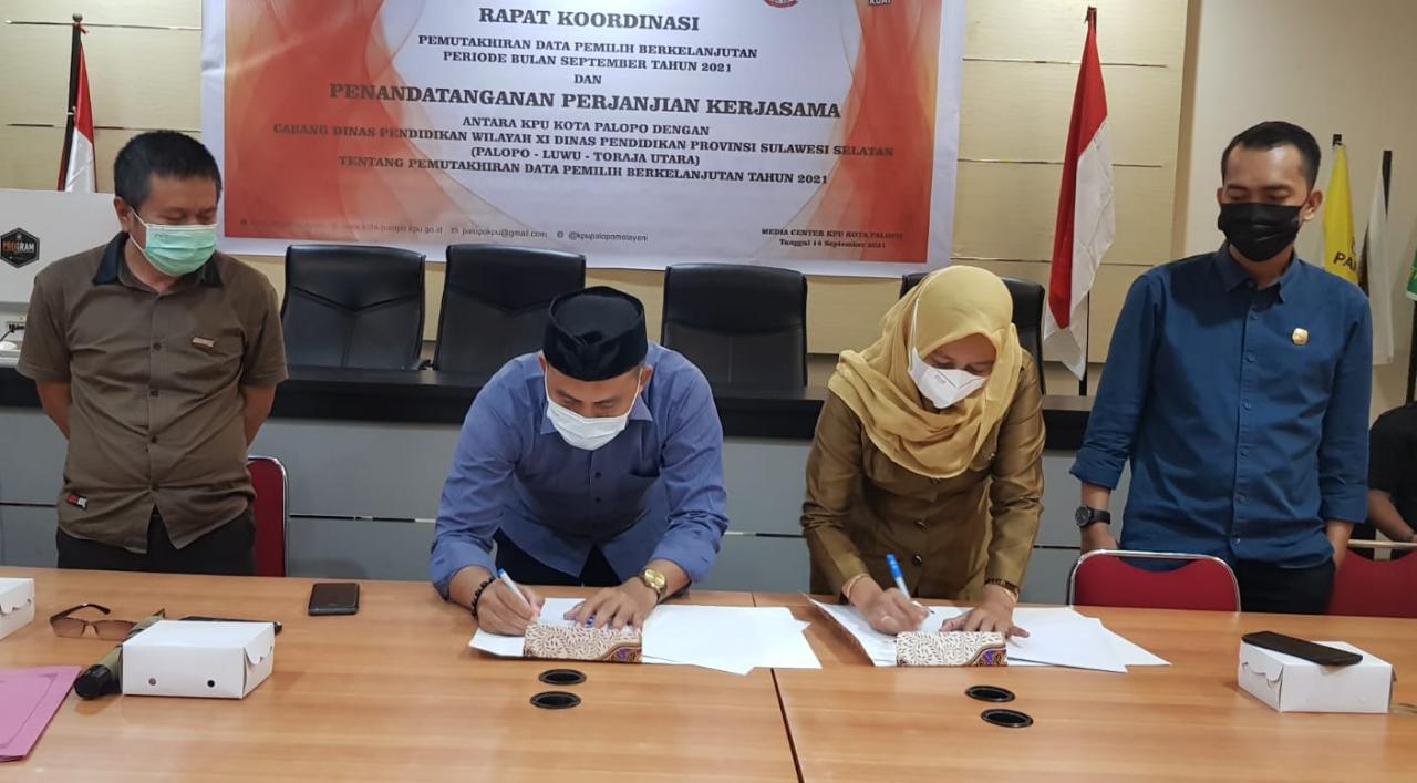 MEDU-ONLINE | PALOPO — Komisi Pemilihan Umum (KPU) Kota Palopo, bersama UPTD Cabang Dinas Pendidikan Wilayah XI Sulsel, tanda tangani Nota Kesepahaman, Selasa 14 September 2021.