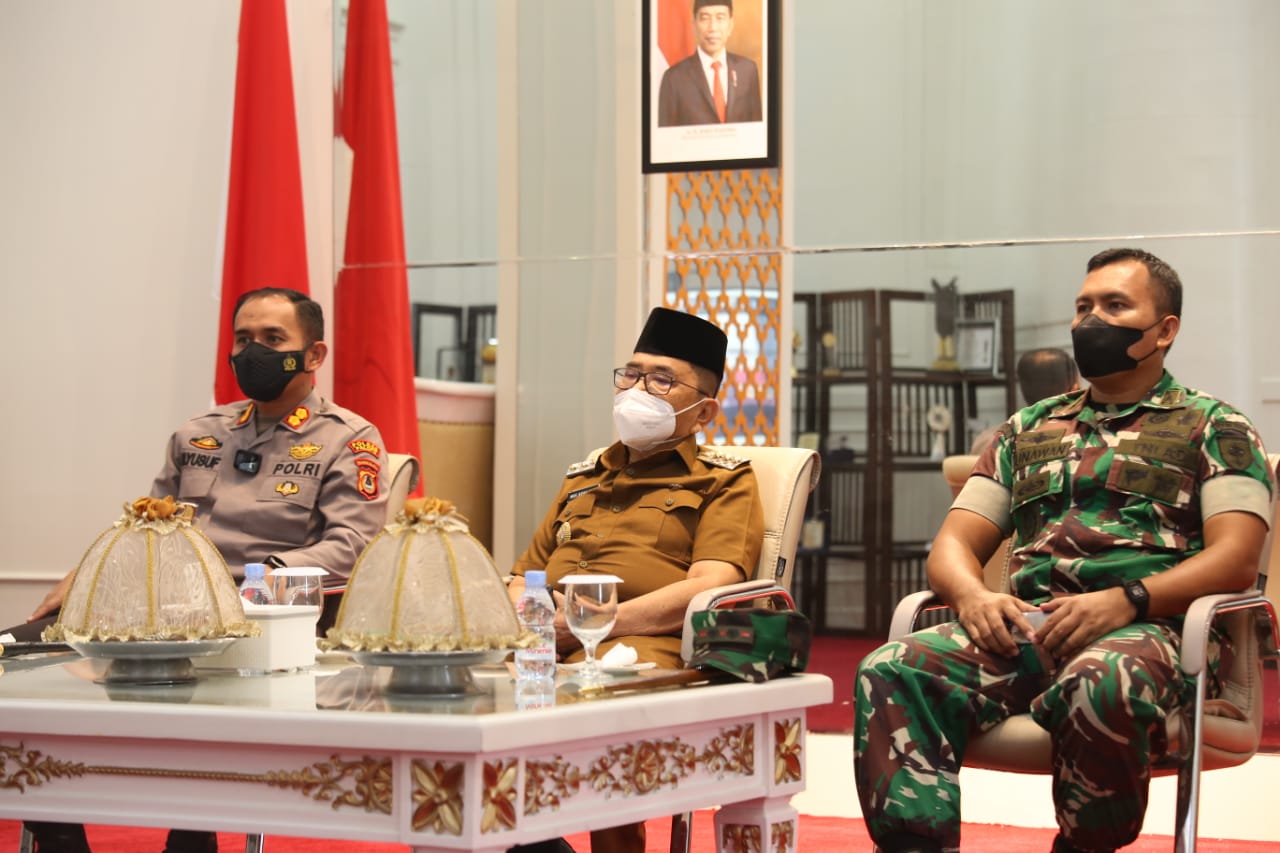 MEDU-ONLINE, PALOPO | Walikota Palopo Drs HM Judas Amir menghadiri kegiatan pengarahan Presiden Republik Indonesia kepada kepala daerah, didampingi Kapolres Palopo bersama Dandim 1403/SWG terkait kasus pandemi corona varian Omicron yang secara global sudah meningkat kasus temuannya. Kegiatan pengarahan ini dilaksanakan di ruang kerja walikota Palopo, Senin (07/02/22).