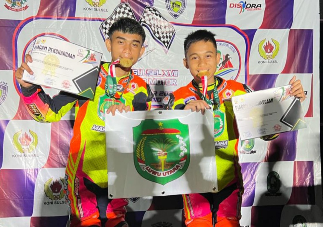 MEDU ONLINE, LUWU UTARA — Afhil Azhraf dan Awadh Shafwan pembalap motor bebek 150cc kelas beregu asal Luwu Utara raih emas di ajang Porprov Sulsel XVII Sinjai-Bulukumba.