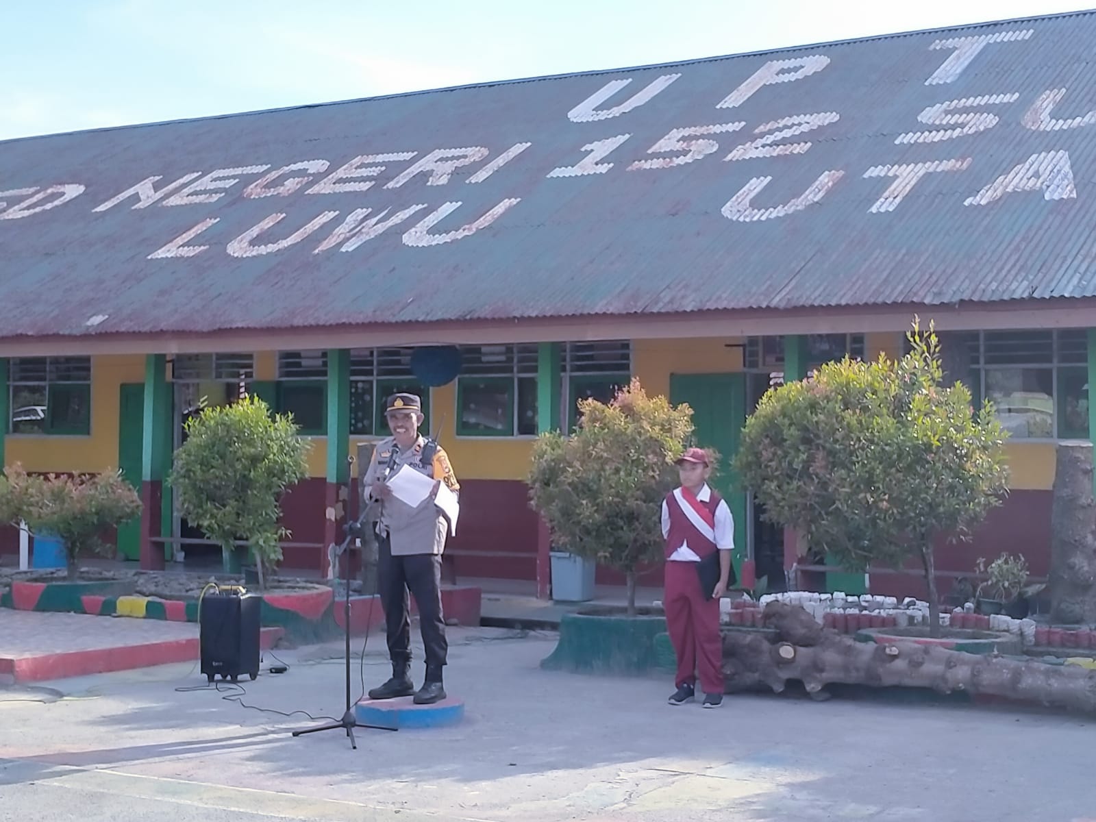 – AIPDA JUFWANDA RUSTAM Bhabinkamtibmas memberi arahan dan membacakan Amanat Seragam Kapolres Lutra kps Siswa/Siswi yg melaksanakan kegiatan Porseni pada SMAN 10 Luwu Utara di Desa Mulyorejo Kec. Sukamaju Selatan
