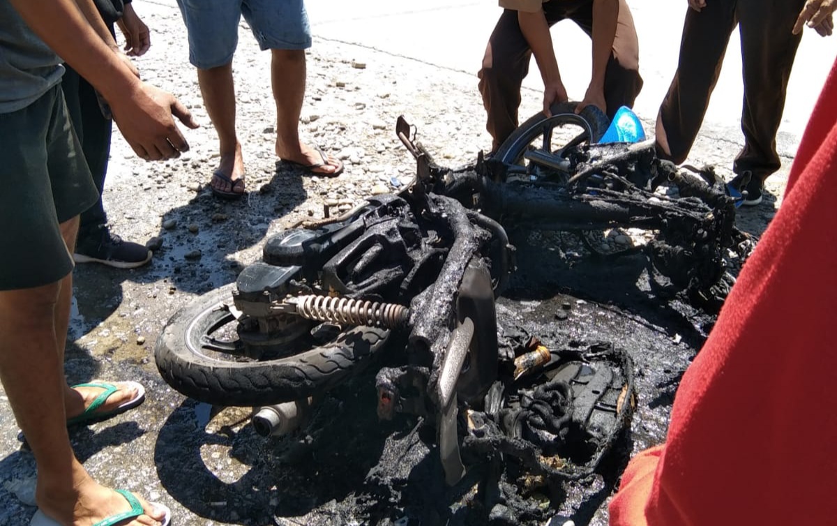 MEDU-ONLINE, LUWU UTARA — Satu unit motor matic hangus terbakar di depan Kantor Camat Baebunta, Desa Sassa, Kecamatan Baebunta, Kabupaten Luwu Utara, Jumat (14/1/2022).