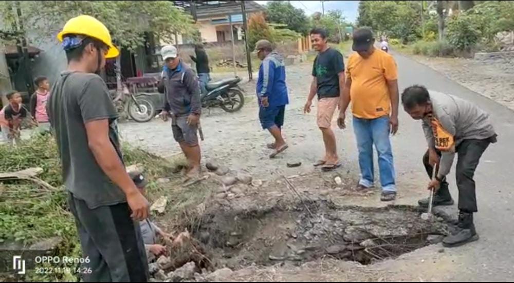 Dengan cara membersihkan sisa plat duiker dan melakukan pemasangan batang kayu agar kendaraan roda empat untuk sementara waktu melintas di jalan tersebut.