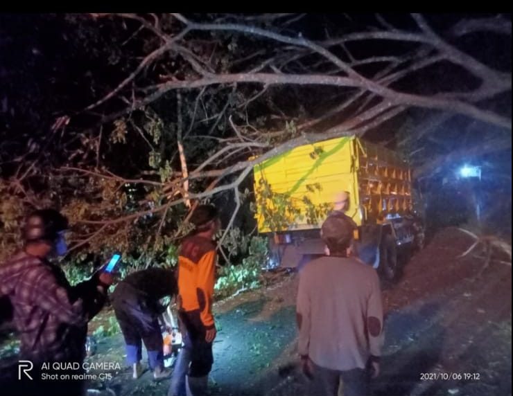 Diperkirakan hujan dan angin kencang menyebabkan pohon yang berukuran cukup besar tersebut tumbang lalu menimpa dua mobil truk yang kebetulan melintas sekira pukul 19.00 Wita.