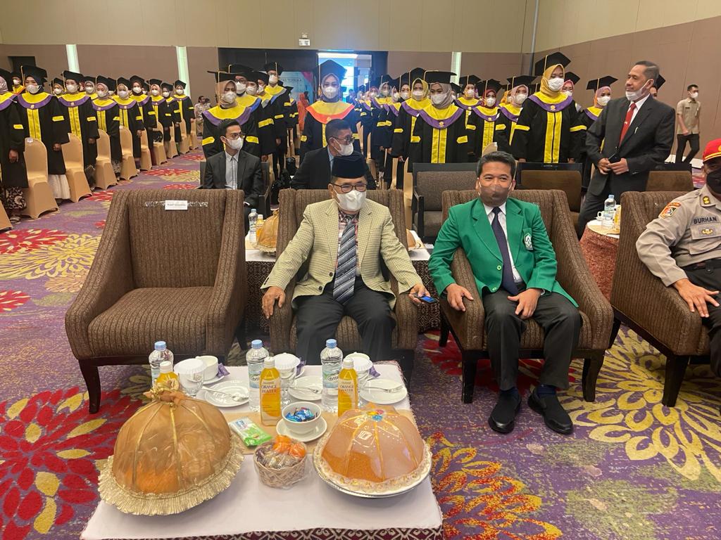 MEDU-ONLINE, MAKASSAR | Walikota Palopo, Drs HM Judas Amir MH bersama Rektor Institut Agama Islam Negeri (IAIN) Palopo, Dr Abdul Pirol MAg mengikuti jalan prosesi Wisuda Daerah Universitas Terbuka (UT) Makassar, di Sandeq Ballroom Claro Hotel, Makassar, Selasa (25/1/2022).