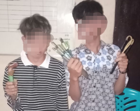 Kedua pemuda tersebut berinisial MN (16) dan SN (20) diamankan karena membawa senjata tajam jenis badik dan senjata tajam jenis peluncur.