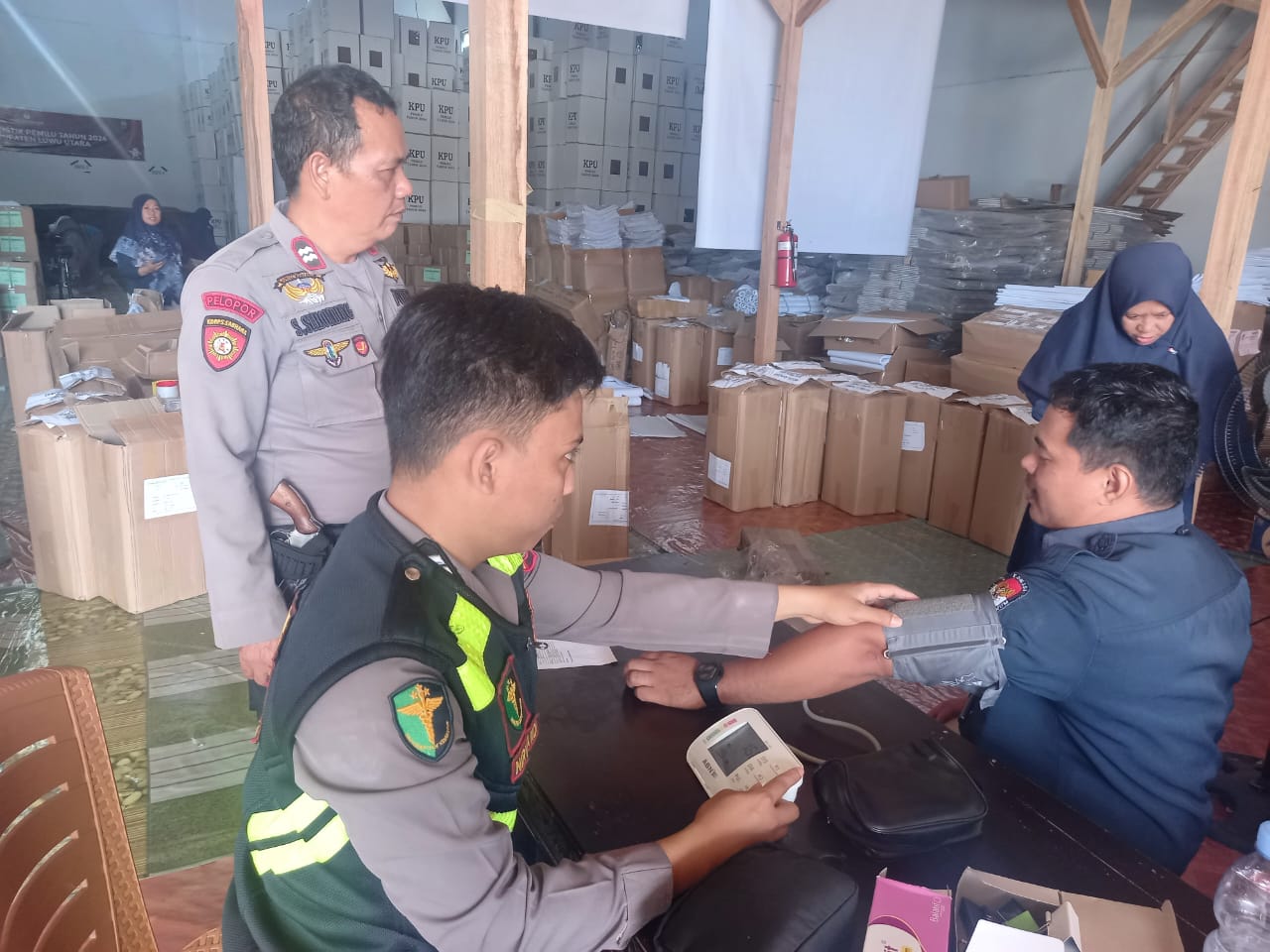 Paurdokkes Polres Luwu Utara, Aiptu Sail Hidayat, bersama dengan Briptu Nirwandi, melaksanakan pengecekan kesehatan yang melibatkan personel pengamanan yang ditempatkan di Gudang Logistik KPU Luwu Utara.