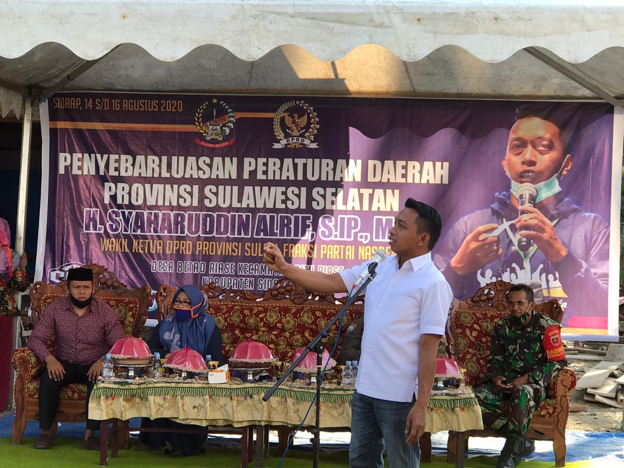 MEDU.ONLINE – Wakil Ketua DPRD Sulsel, Syaharuddin Alrif melakukan sosialisasi penyebarluasan peraturan daerah Provinsi Sulawesi Selatan di Desa Betao Riase, Kec. Pitu Riawa, Kab. Sidenreng Rappang, Sabtu (15/08/2020).