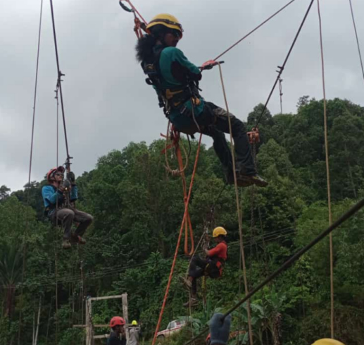 Relawan membangun jembatan tersebut menggunakan bahan berupa papan kayu dan tali sling.