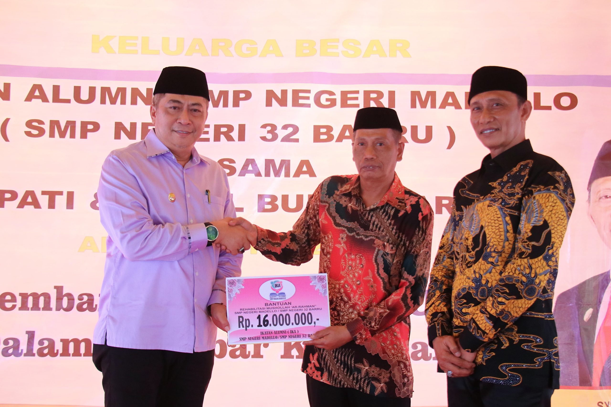 Membangun sinergitas umat dalam menebar kebaikan yang dirangkaikan dengan Rapat Kerja IKA Alumni, juga diserahkan bantuan Alumni untuk rehabilitasi Mushallah SMPN 32 yang dirahkan oleh Wakil Bupati Barru, Abustan A. Bintang kepada Kepala SMPN 32 Bsrru Ali Imran, turut disaksikan Ketua IKA SMPN 32 Barru, Syamsu Rijal yang juga Anggota DPRD Barru.