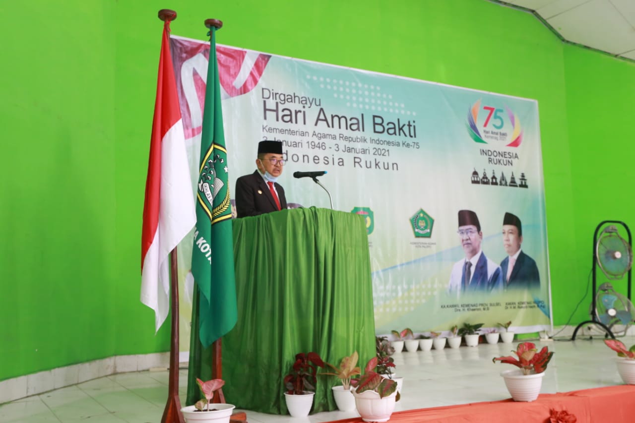 Pada Kesempatan itu, Kepala Kemenag Kota Palopo Dr. H. M. Rusydi Hasyim, M.Ag menyampaikan pelaksanaan Peringatan Hari Amal Bakti hari ini sangat berbeda dengan tahun sebelumnya karena saat ini kita masih menghadapi pandemi Covid-19.